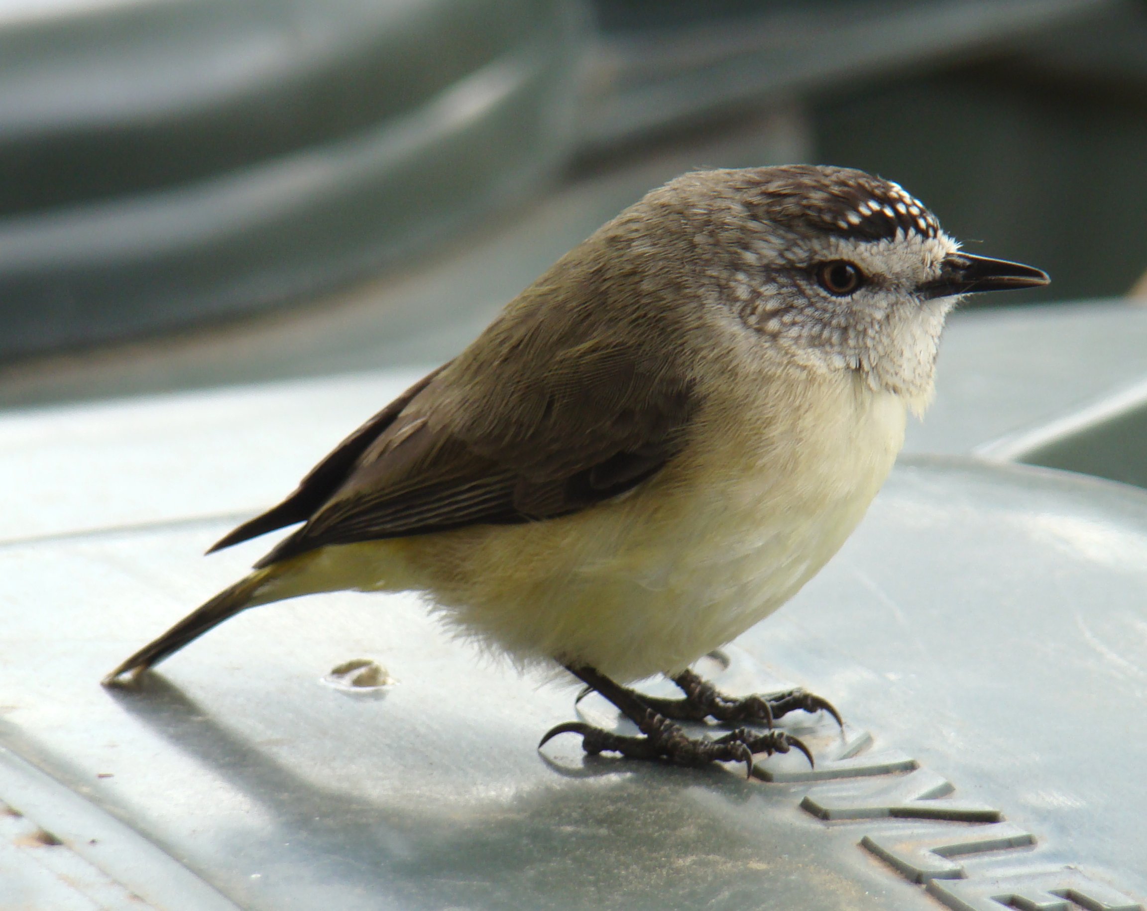 Description: A bird sitting on top of a metal object with a name on it's side and a black and white face.