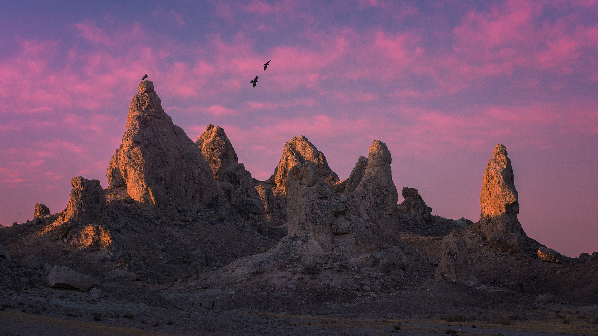 Description: A bird flying over a mountain range at sunset with a pink sky in the background and a pink cloud in the sky.