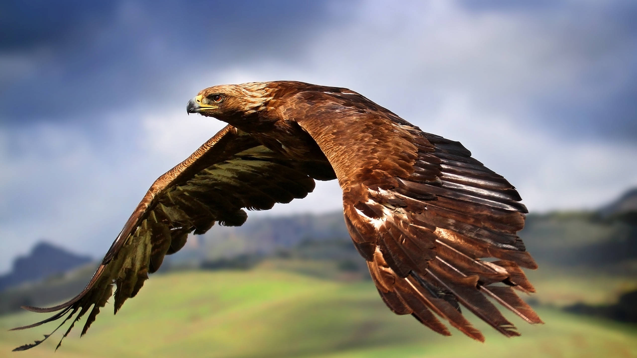 Description: A bird of prey flying in the air with its wings spread out and wings spread wide open.