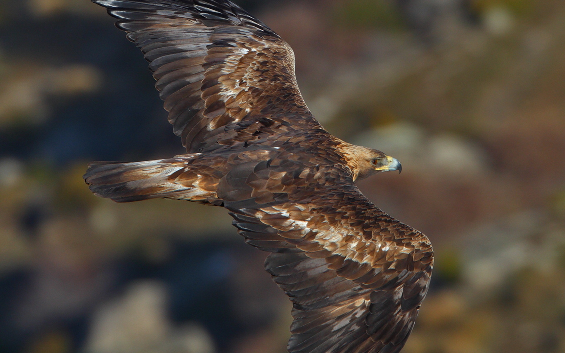 Description: A bird of prey flying in the air with its wings spread out and wings spread wide open.