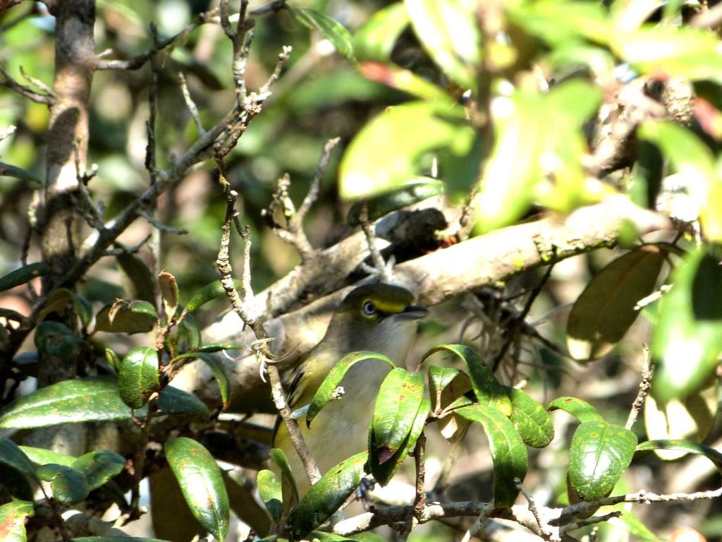 Description: A bird is perched on a branch in a tree with leaves and branches around it.