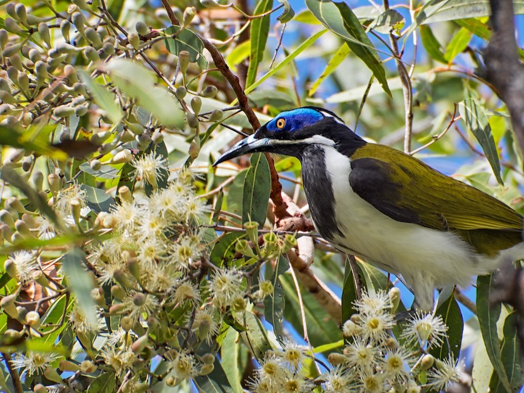 Description: A bird is perched on a branch of a tree with white flowers and green leaves on it's branches.
