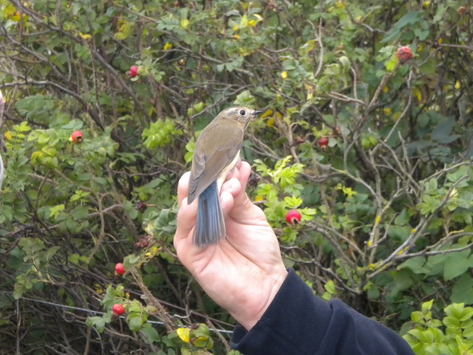 Description: A bird perched on a persons hand in front of a bush with red berries on it and a bird perched on a persons hand in front of a bush with red berries on it.