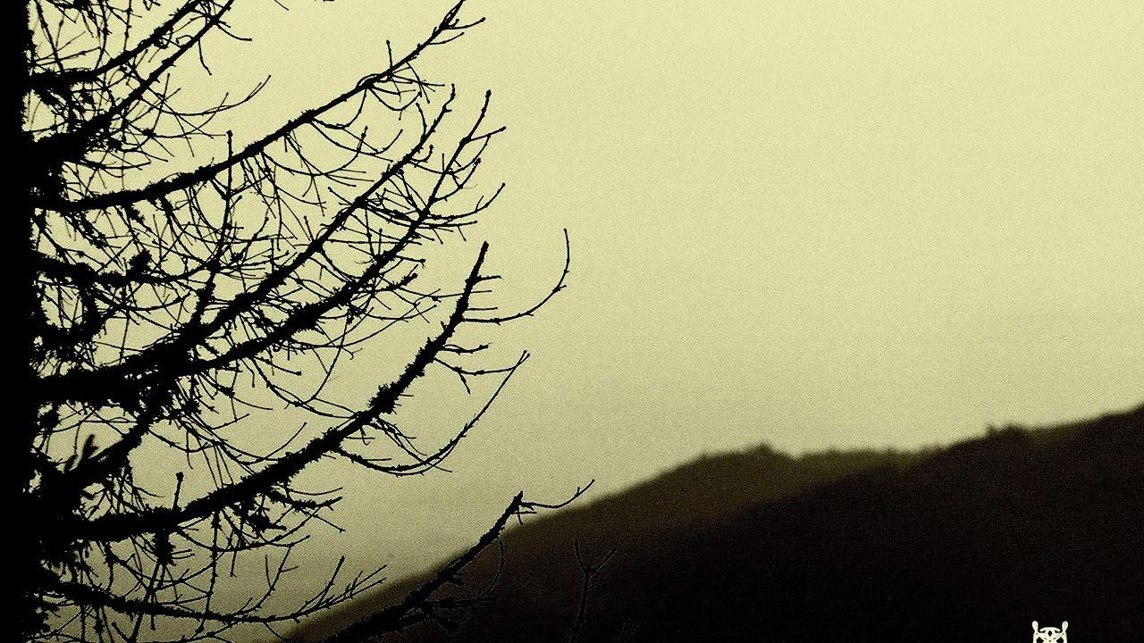 Description: A bird perched on a tree branch in the foggy sky above a hill side area with a tree in the foreground.