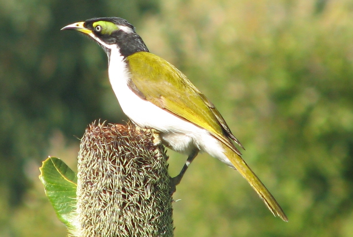 Description: A bird perched on top of a tree branch in a forest area with trees in the background and a green and white bird on top of a tree.