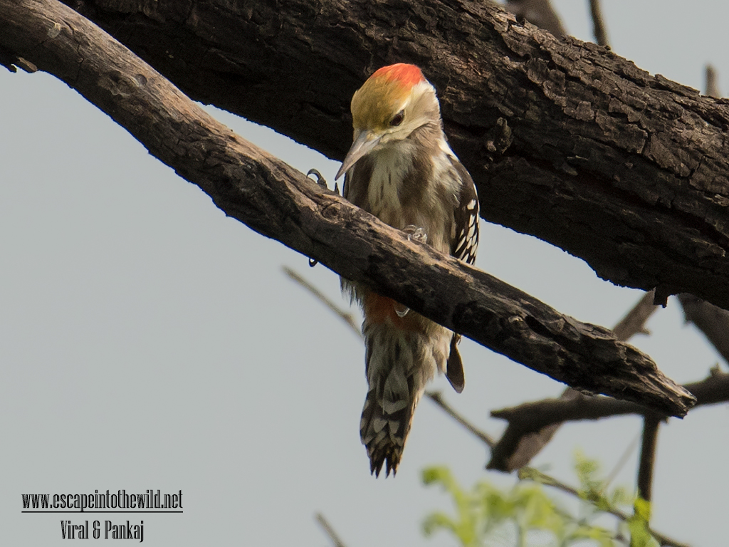 Description: A bird perched on a branch of a tree with a sky background in the background and a tree branch with a bird on it.