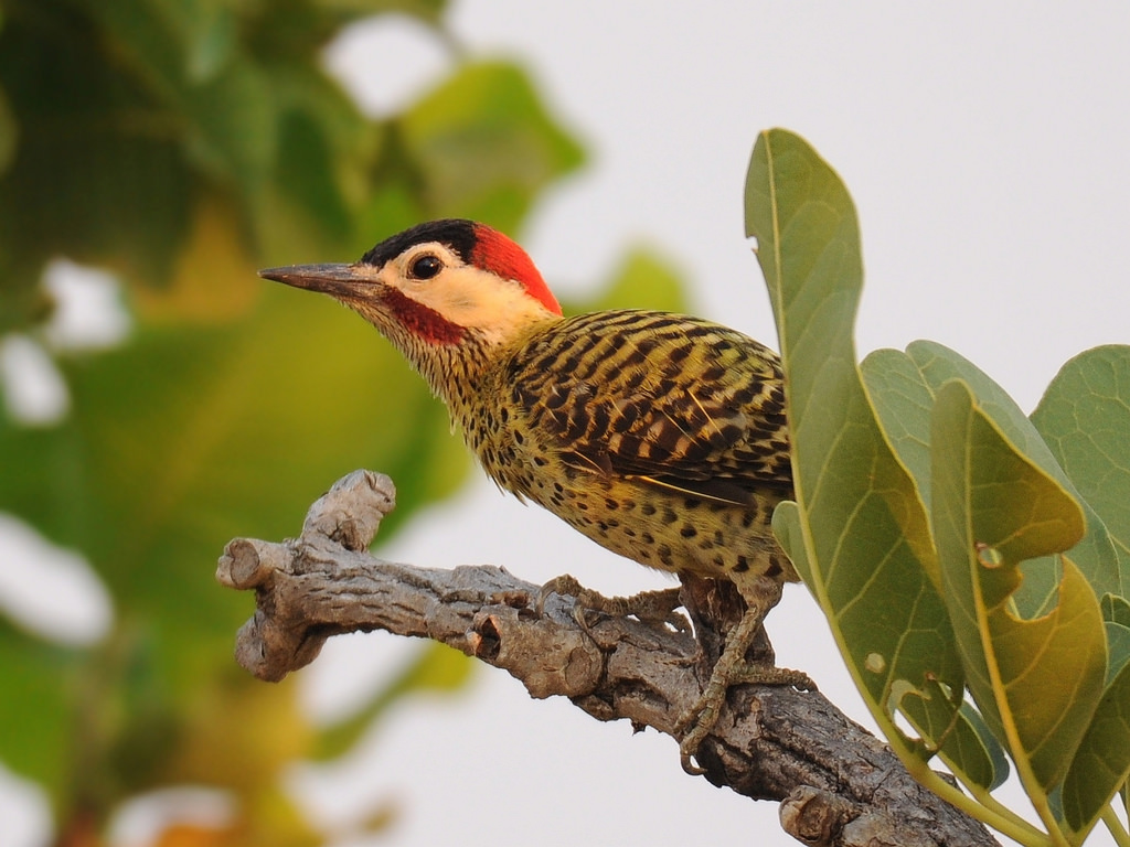 Description: A bird perched on a branch with leaves around it's neck and head.