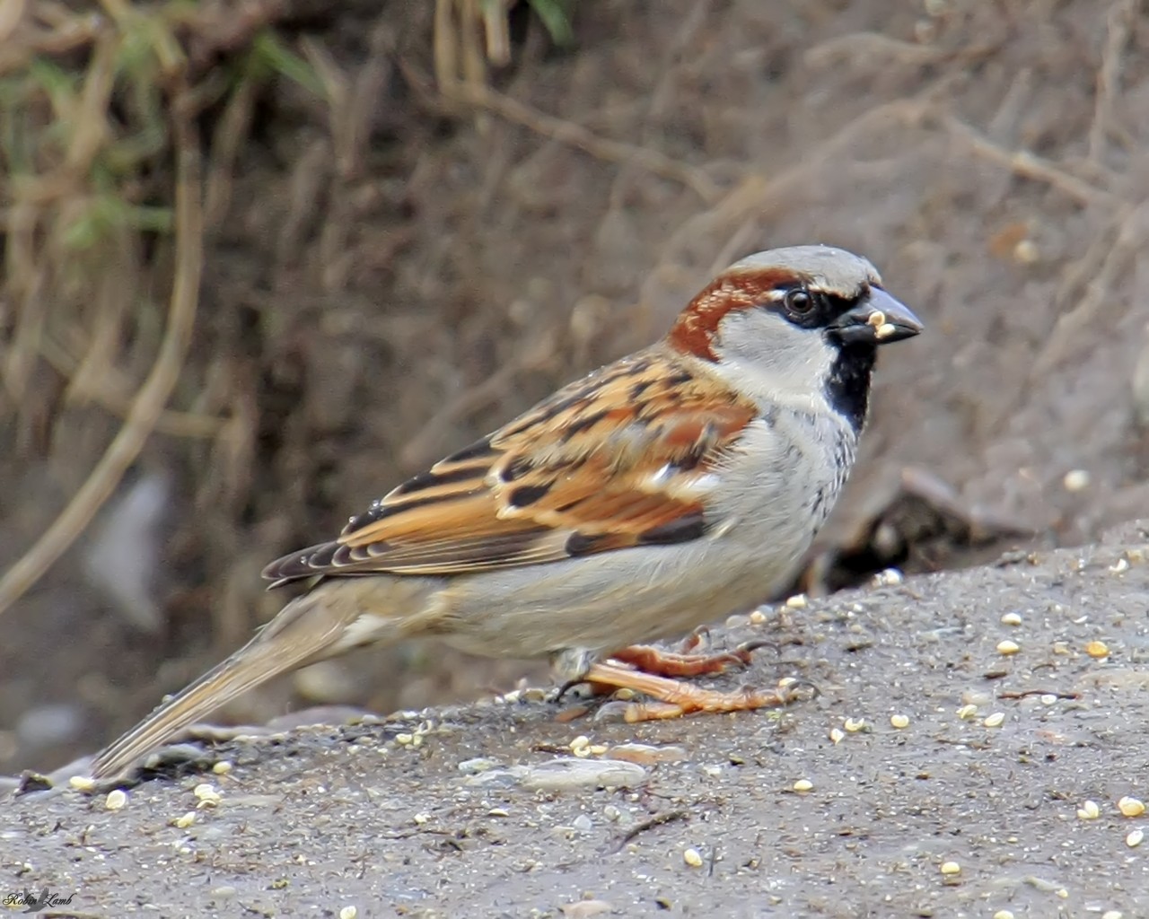 Description: A bird is standing on a rock outside by some bushes and dirt and rocks and grass and dirt is behind it.