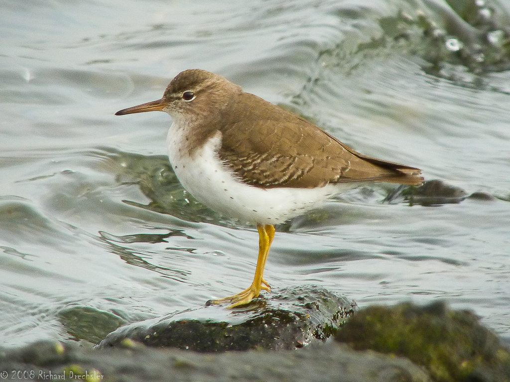 Description: A bird standing on a rock in the water near the shore of a beach area with waves coming in.