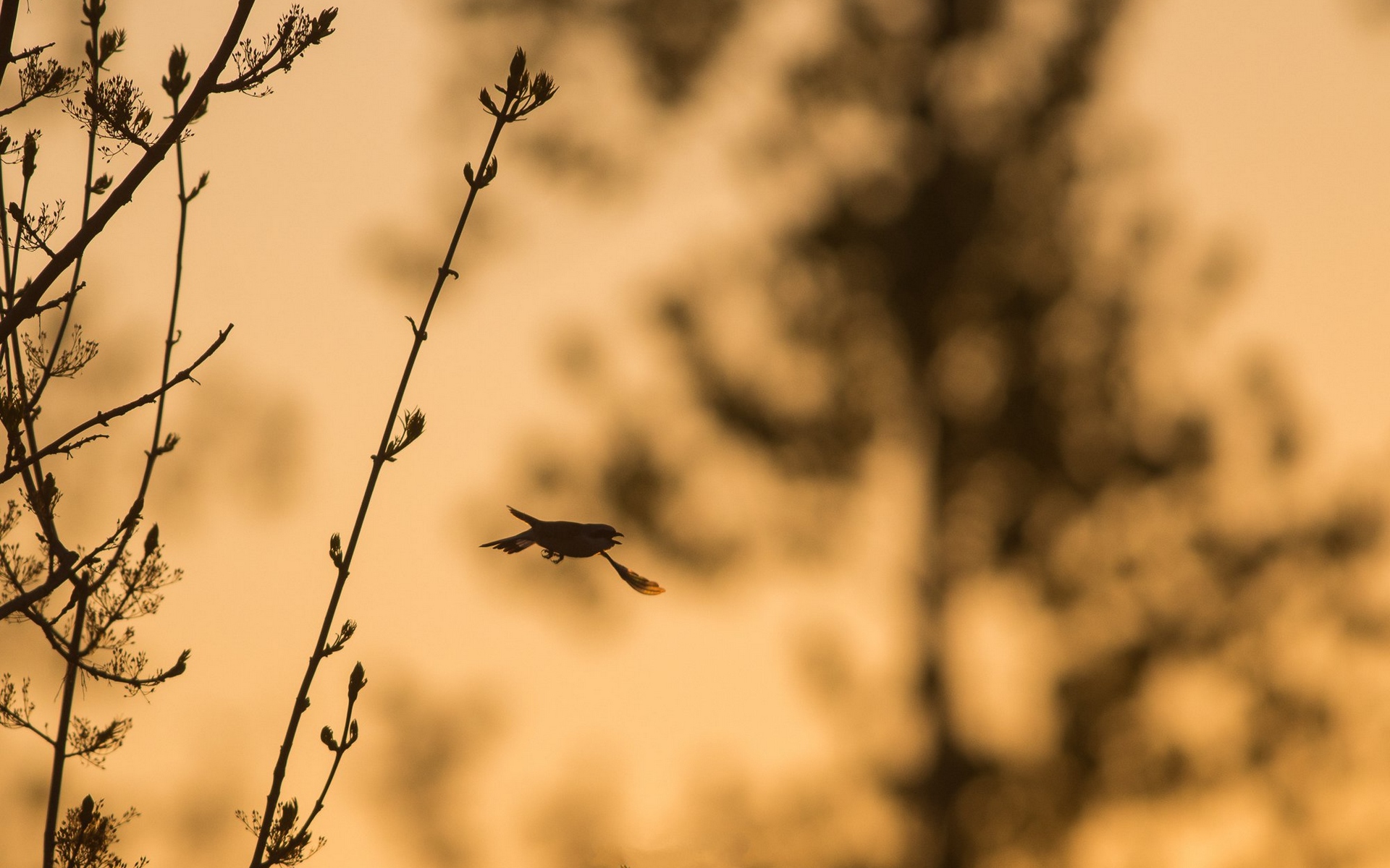 Description: A bird flying over a tree branch at sunset or dawn with a silhouette of a tree in the background.