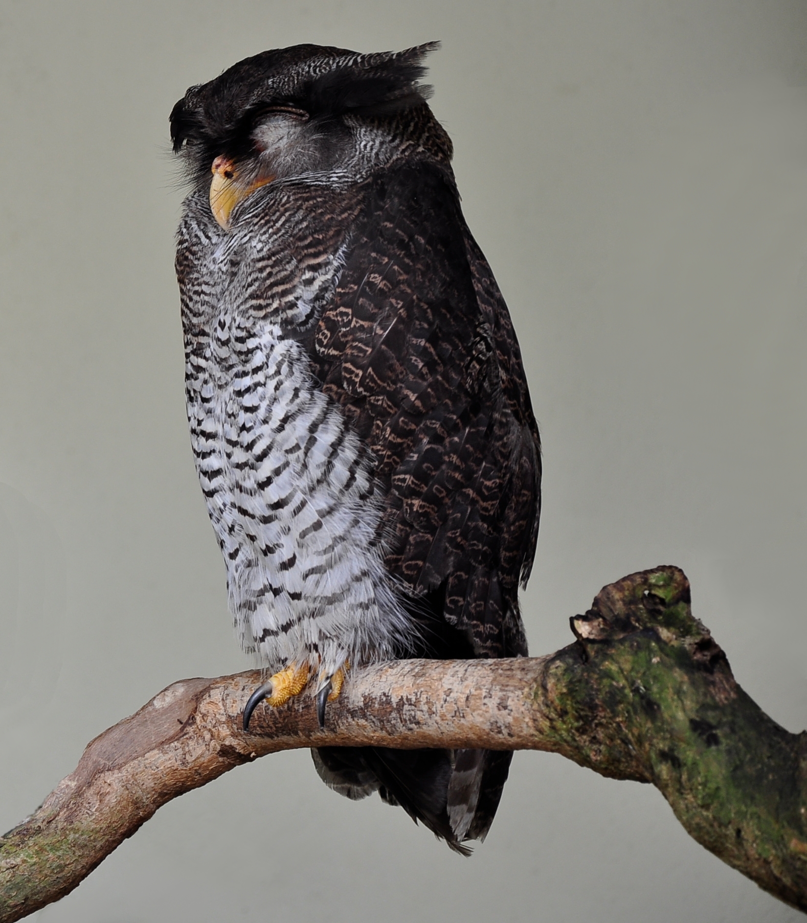 Description: A bird sitting on a branch with a white background behind it and a gray wall behind it.