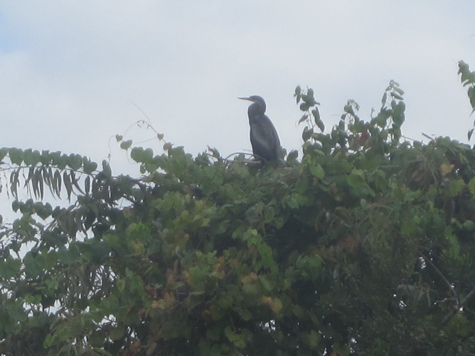 Description: A bird sitting on top of a tree branch in a forest area with leaves and branches around it.