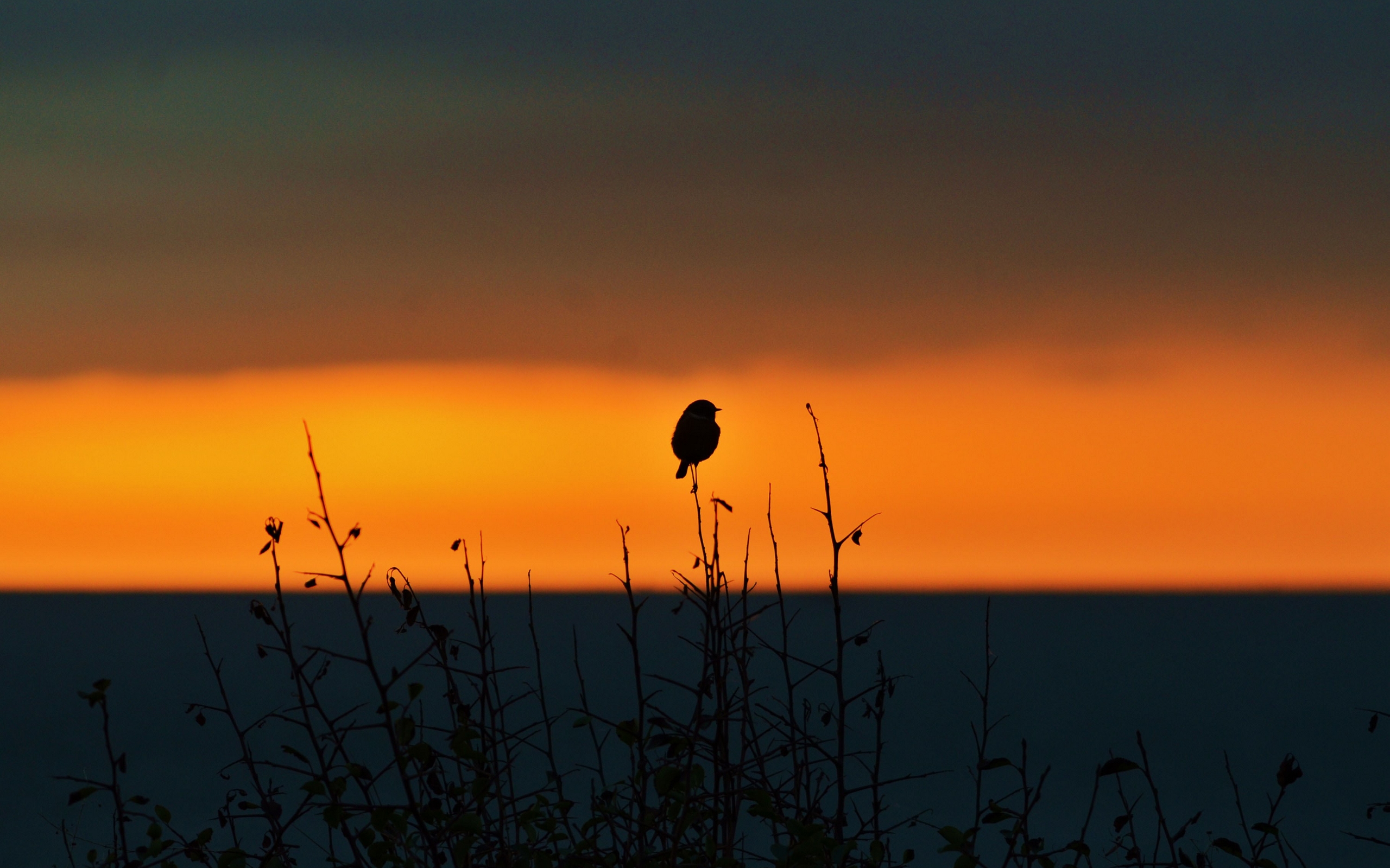 Description: A bird sitting on top of a tall plant next to a sunset sky with clouds in the background and a bird on top of a tree.