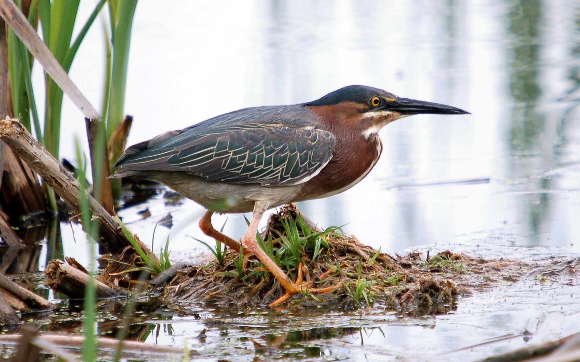 Description: A bird standing on a patch of grass in a swampy area with water and reeds in the background.