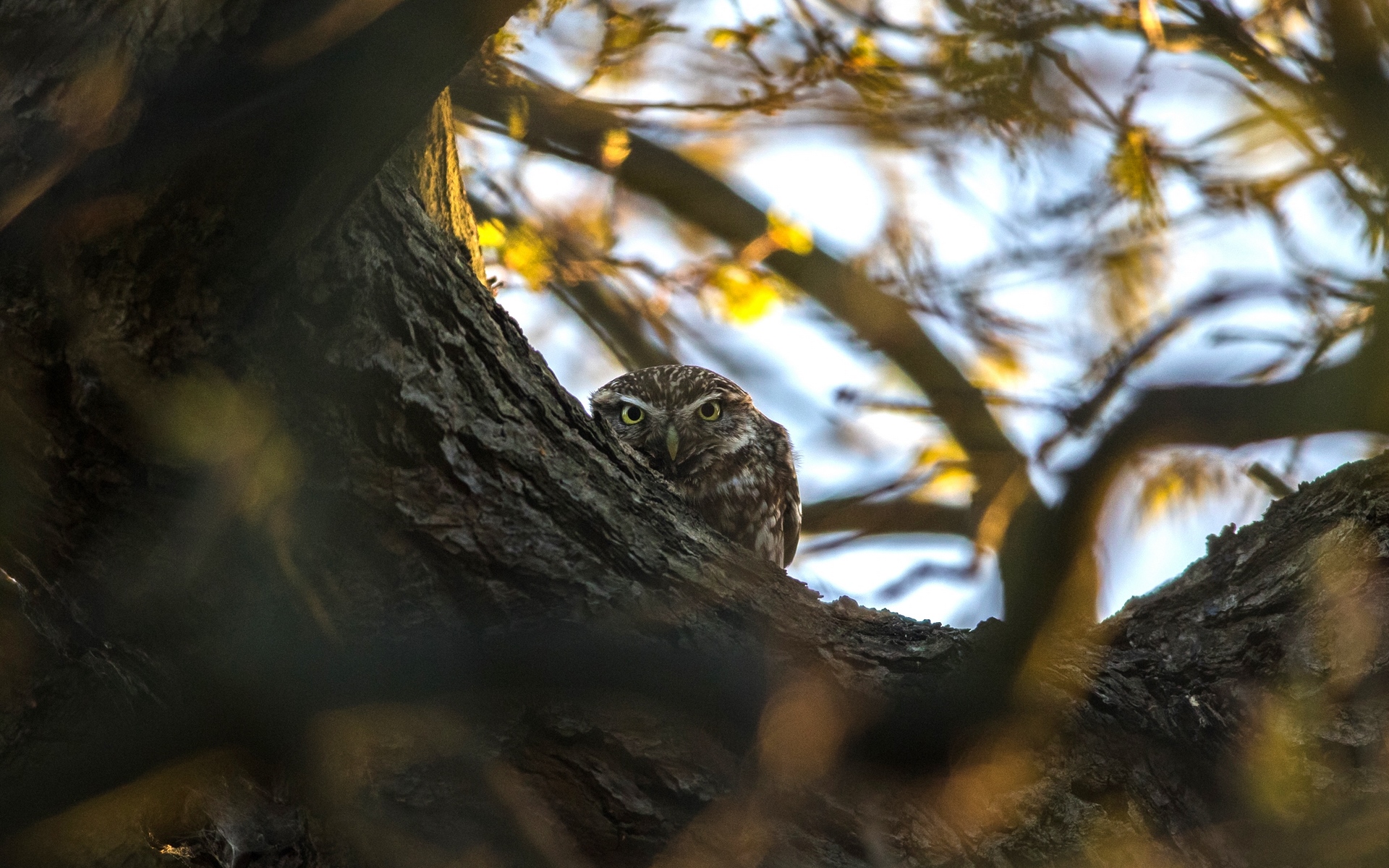 Description: A bird is sitting in a tree looking out from behind the branches of the tree.