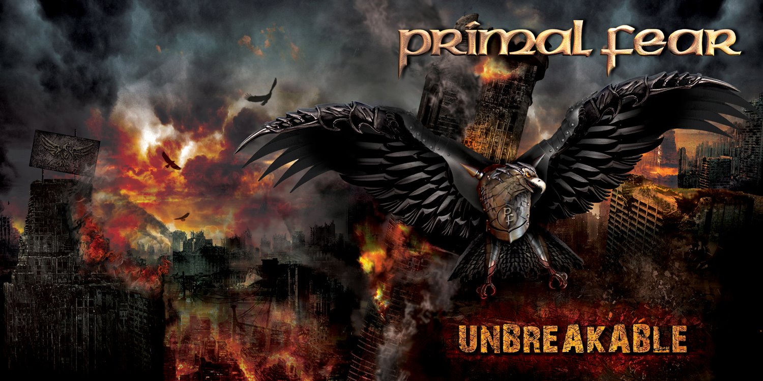Description: A bird with its wings spread out in front of a city skyline with flames and birds flying above it.