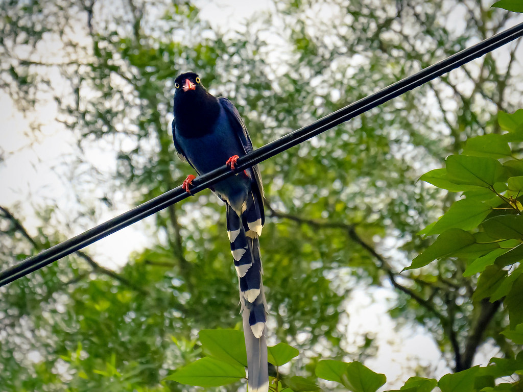 Description: A bird sitting on a wire in front of trees and leaves with a sky background with clouds in the distance.