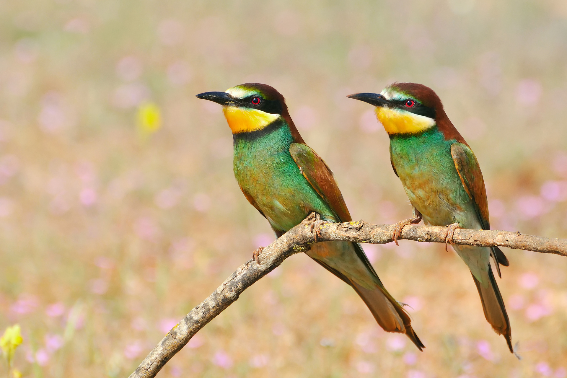 Description: Two birds sitting on a branch in a field of flowers and grass with pink flowers in the background and a yellow and green beak.