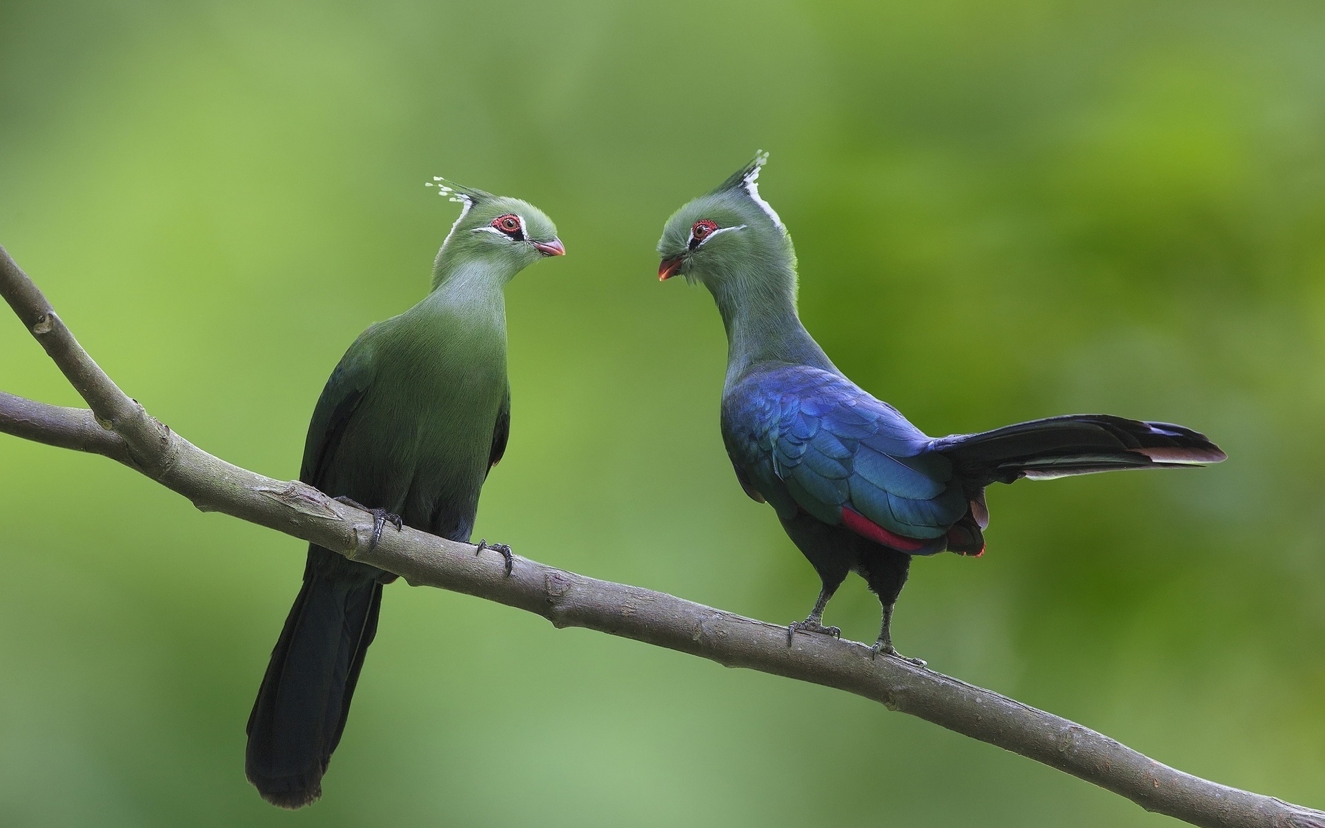 Description: Two birds sitting on a branch with their beaks open and eyes closed.