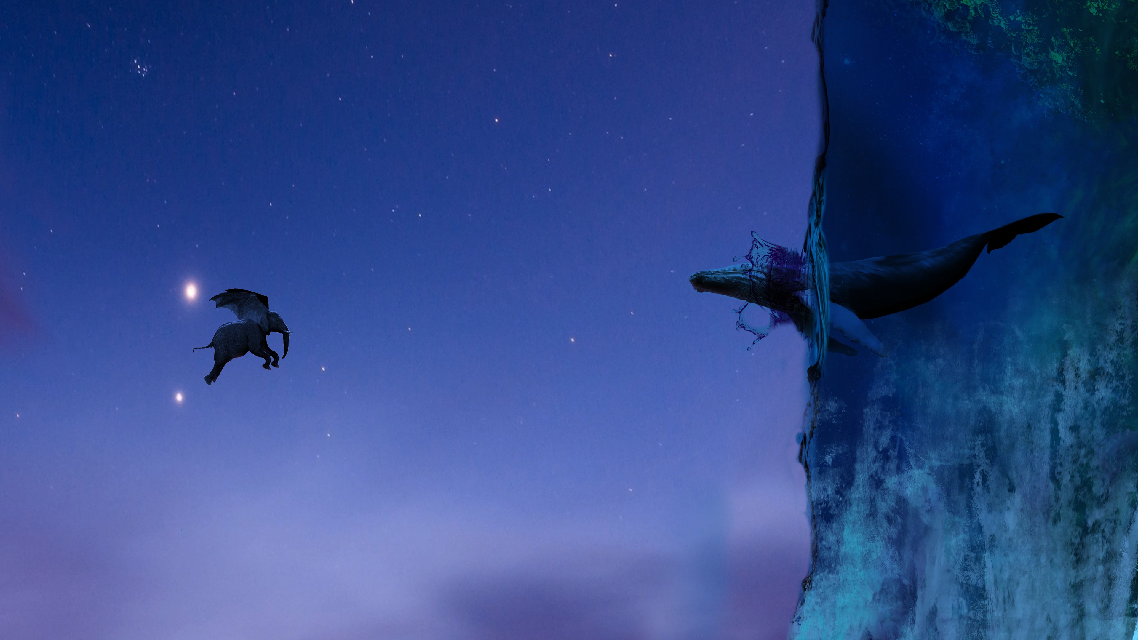 Description: A couple of birds flying over a cliff under a purple sky with stars and a crescent moon in the distance.