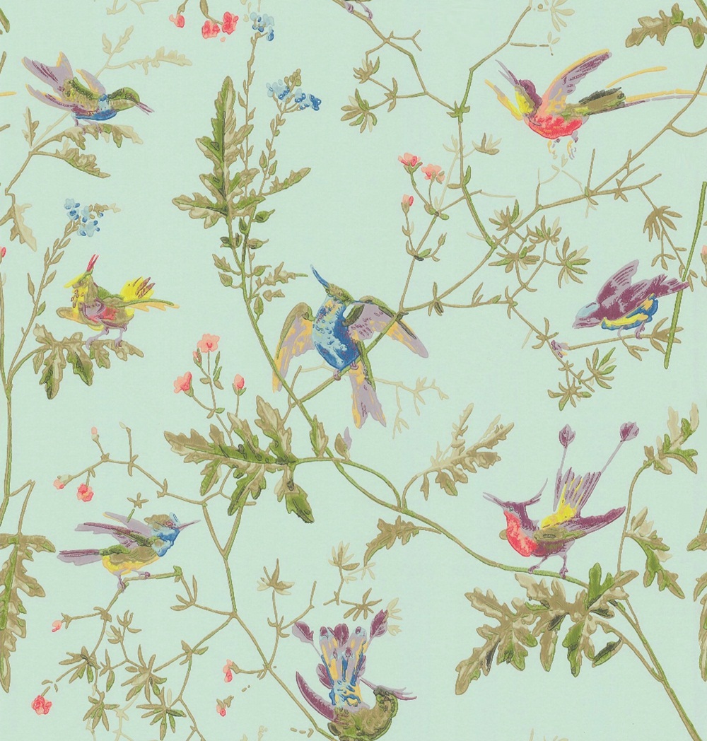 Description: A painting of birds and flowers on a blue background with green leaves and flowers on the branches of a plant.