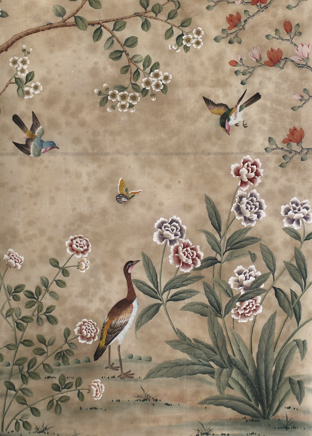 Description: A painting of birds and flowers on a wall with a tree branch and flowers in the background with a bird on the branch.