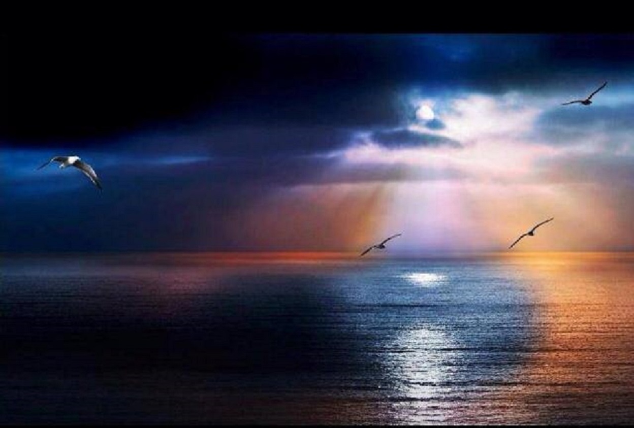 Description: A group of birds flying over a body of water under a cloudy sky with sunbeams and a light beam.