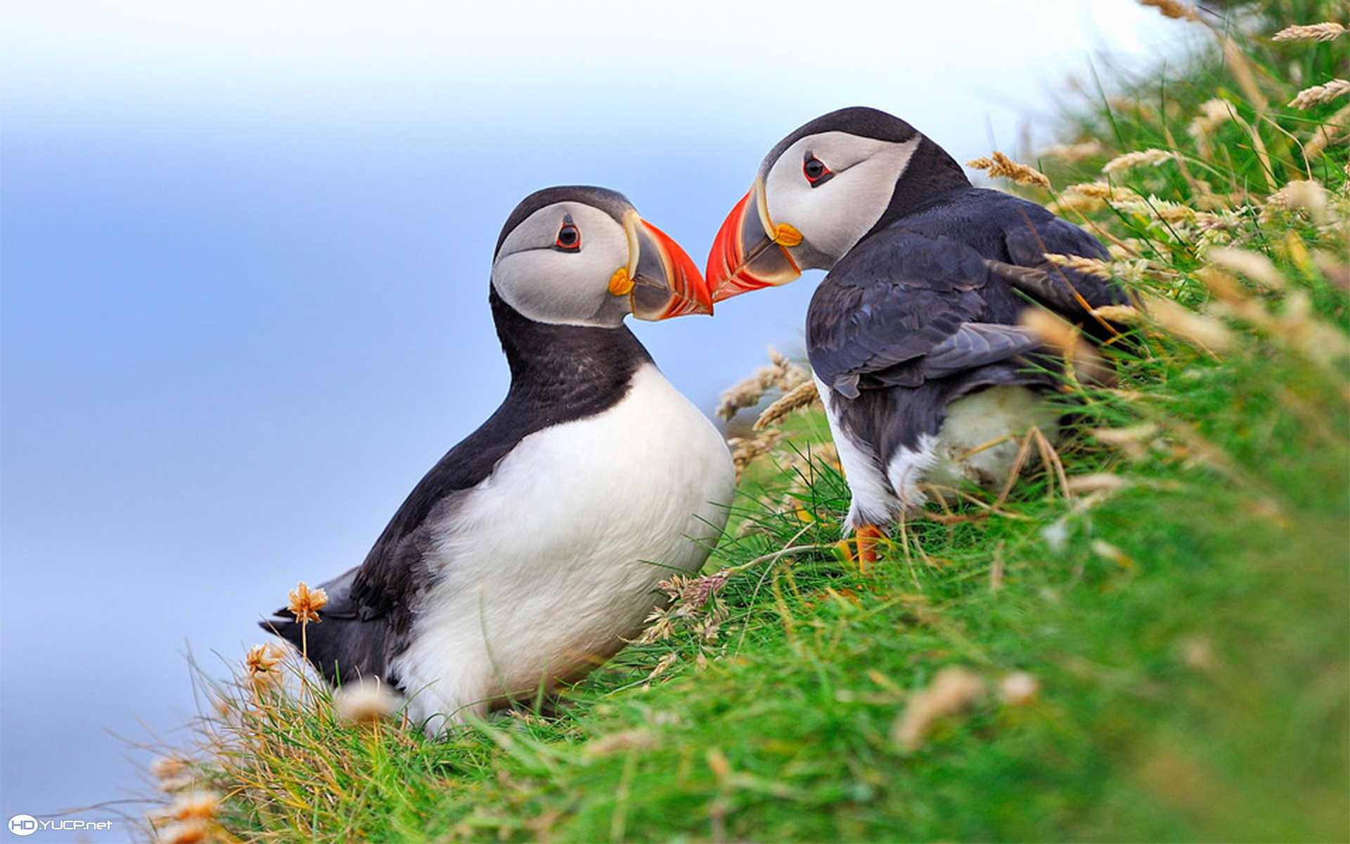 Description: Two birds sitting on a grassy hill with blue sky in the background and one bird with a red beak.