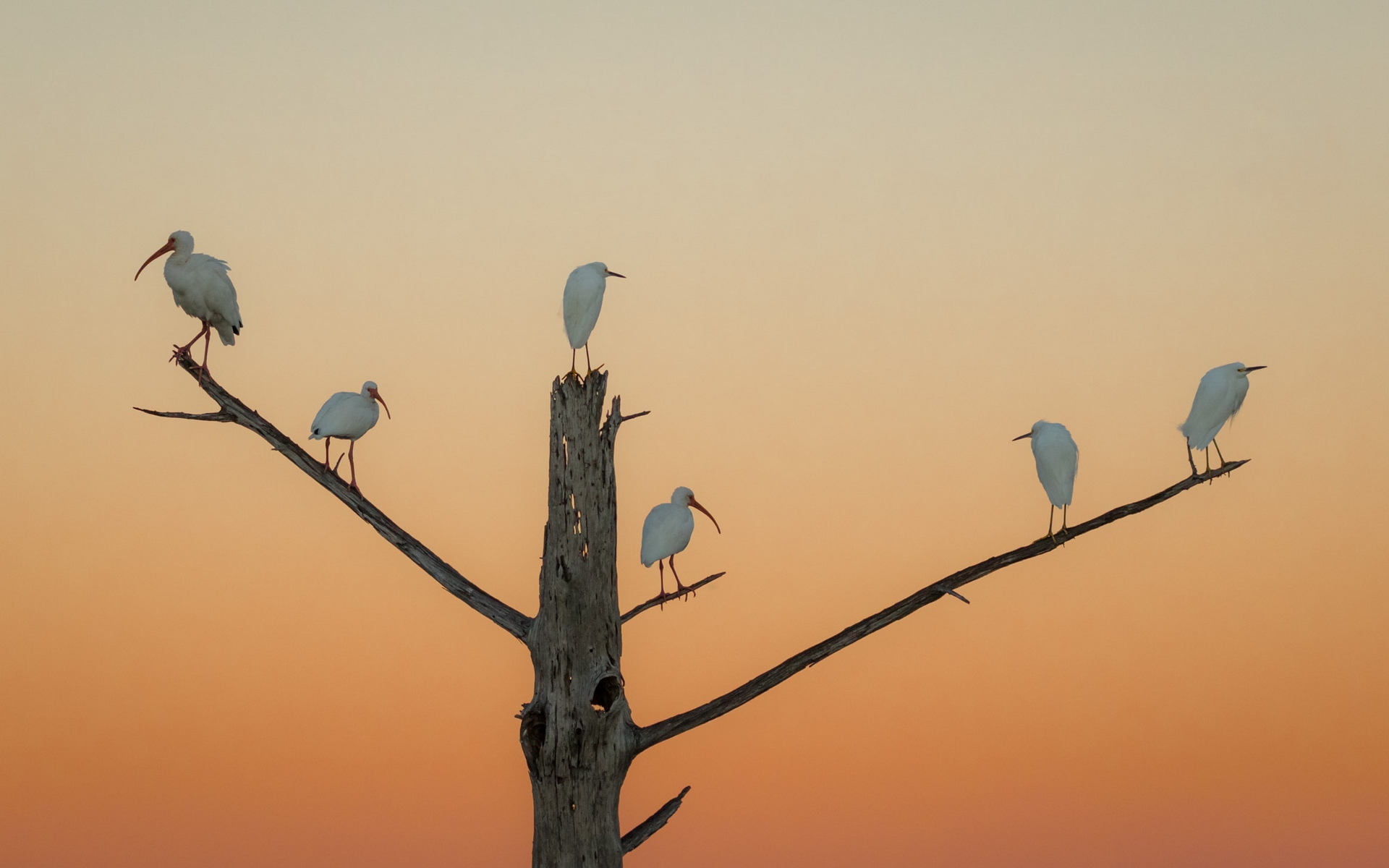 Description: A group of birds sitting on top of a tree branch at sunset or dawn in the sky.