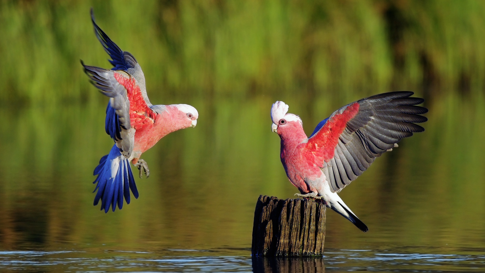 Description: Two birds are perched on a wooden post in the water near a marshy area with green grass and water.