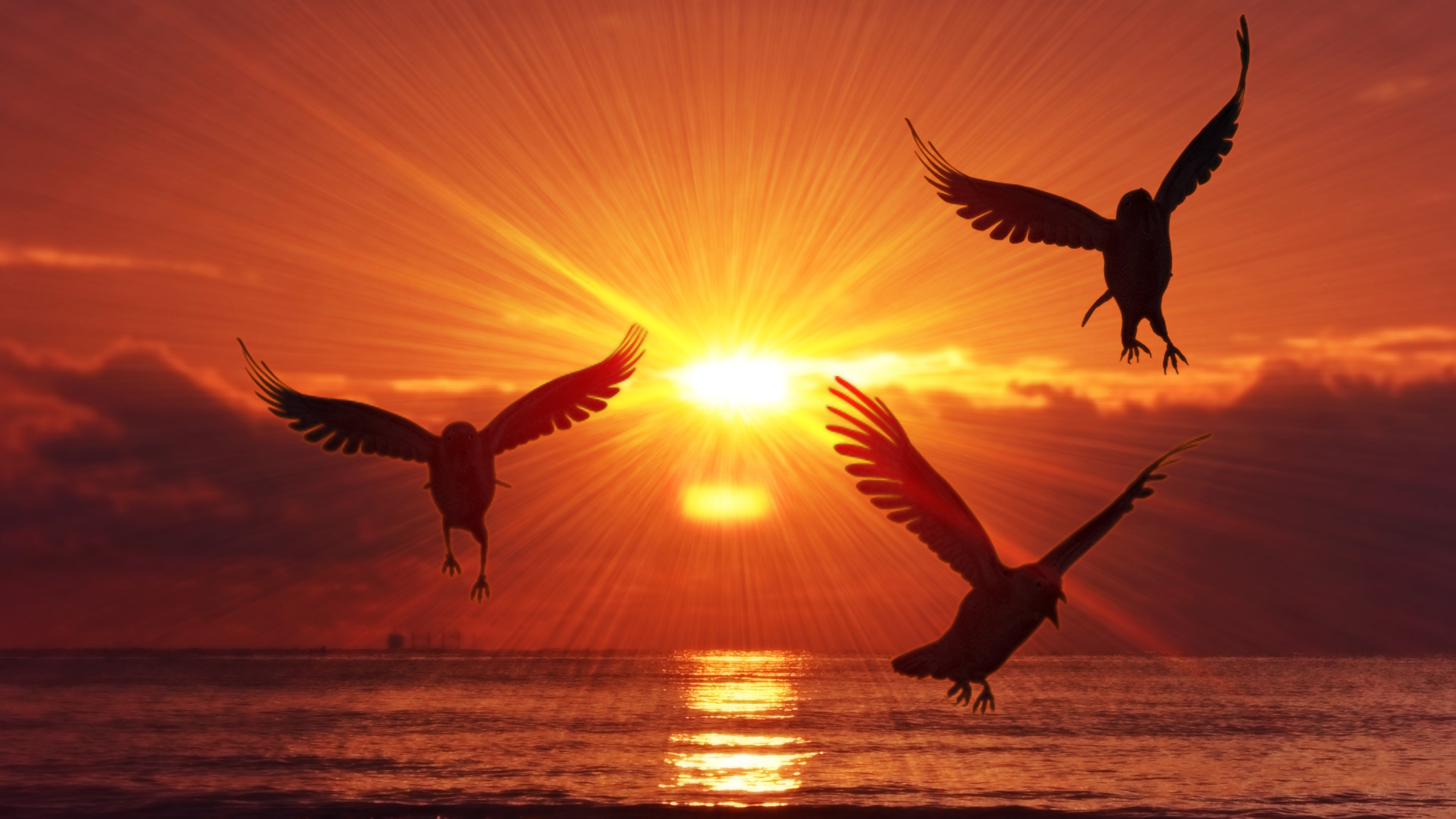 Description: Three birds flying in the air over the ocean at sunset or sunrise time with the sun shining through the clouds.