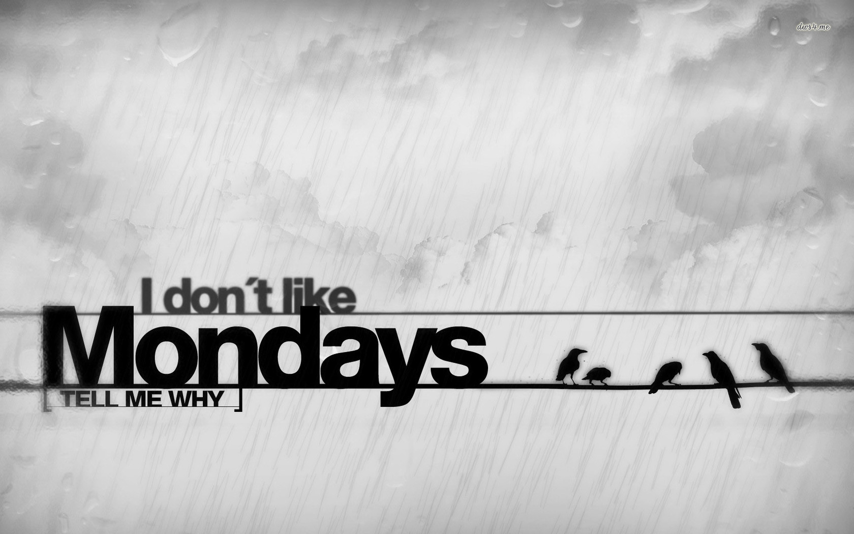 Description: A black and white photo of birds on a wire with words that say i don't like mondays tell me why.