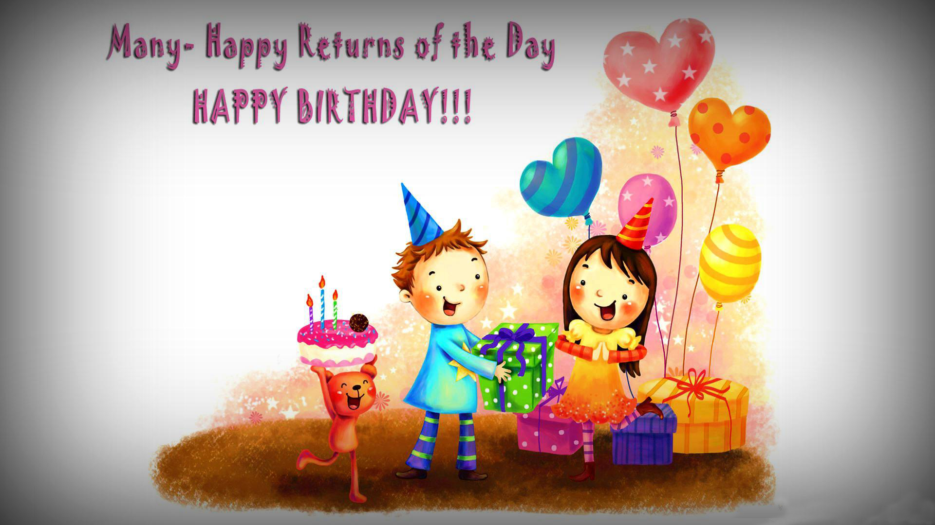 Description: A boy and girl celebrating a birthday with a cake and balloons and a gift box with a candle on it.
