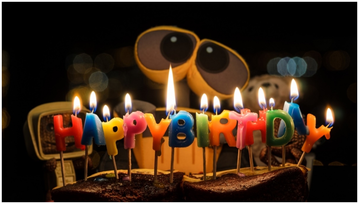 Description: A birthday cake with candles that spell out happy birthday on it with a stuffed animal in the background and a lit candle in the middle.