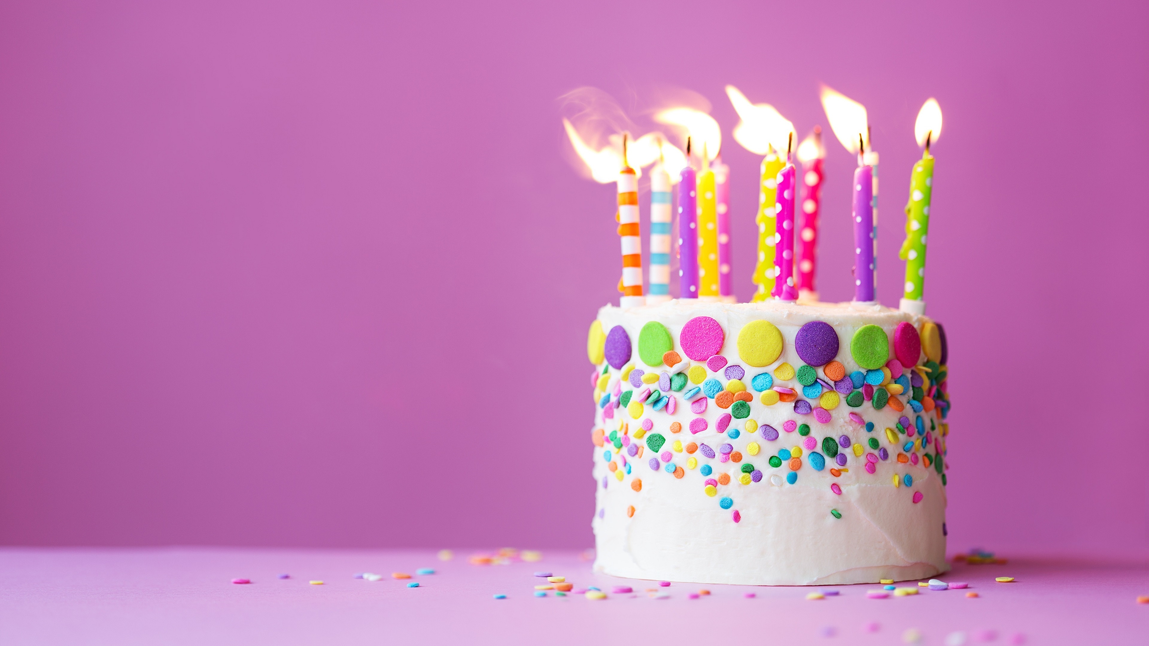 Description: A birthday cake with candles on a purple surface with confetti and sprinkles on it.