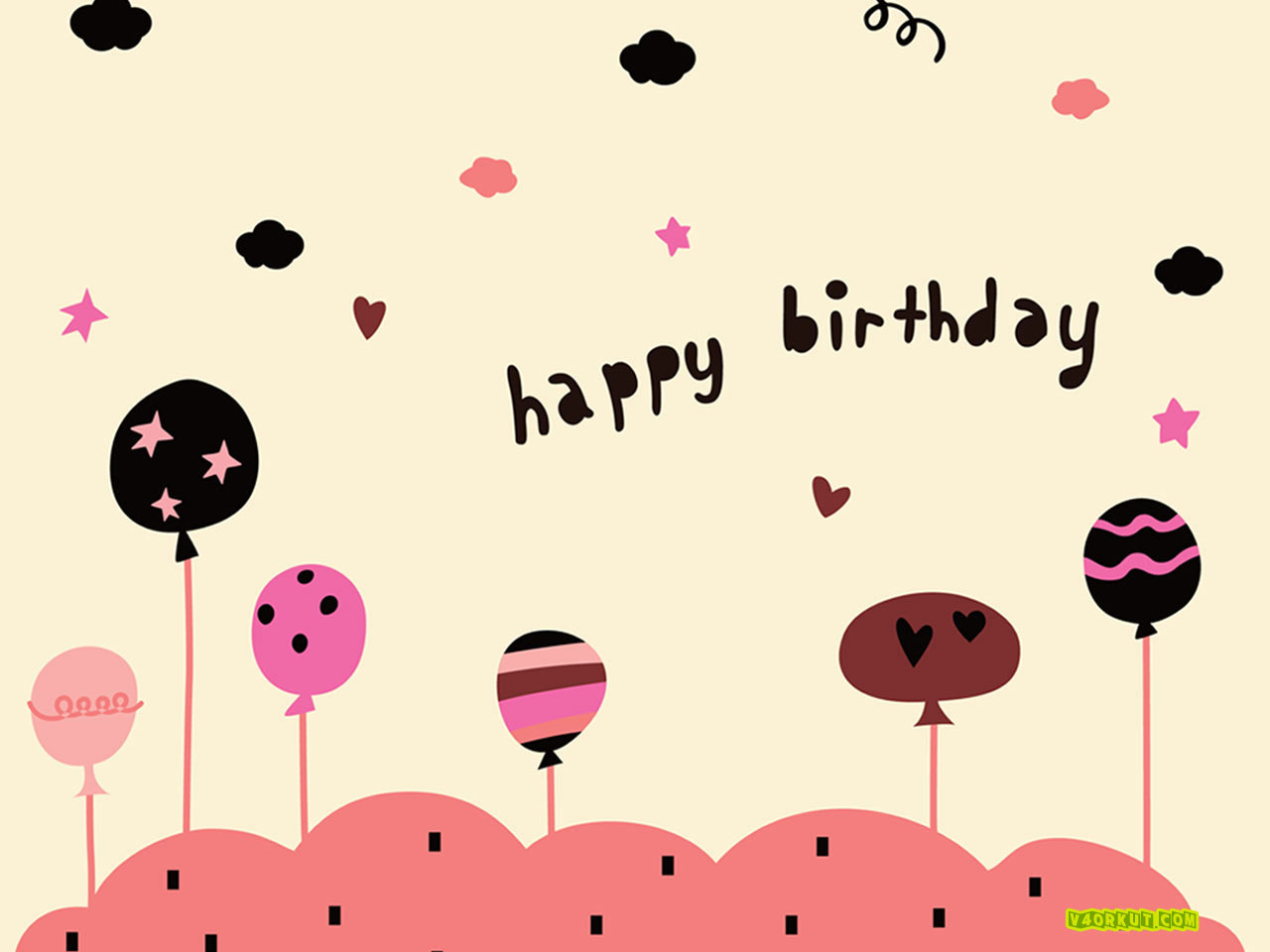 Description: A birthday card with a pink hill and trees with balloons and stars on it.