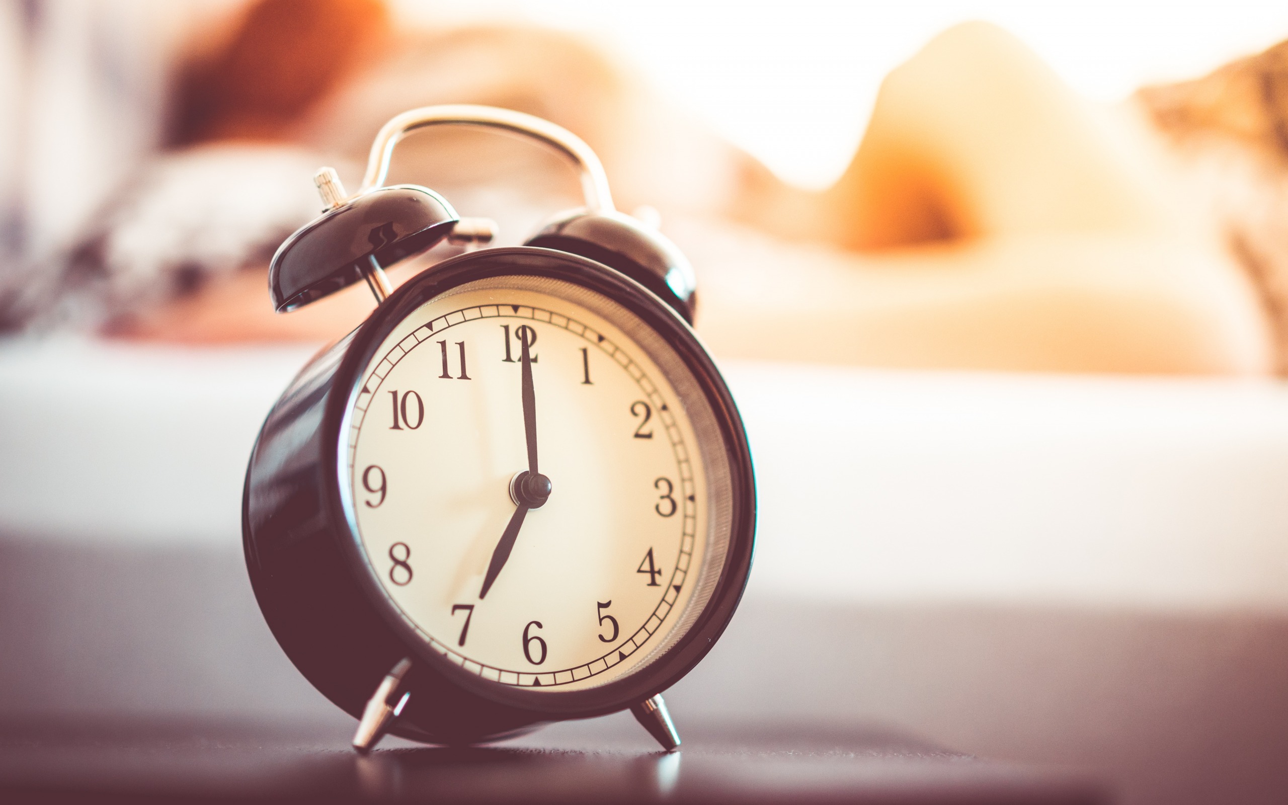 Description: A black alarm clock sitting on top of a table next to a woman in a bed with a cat.