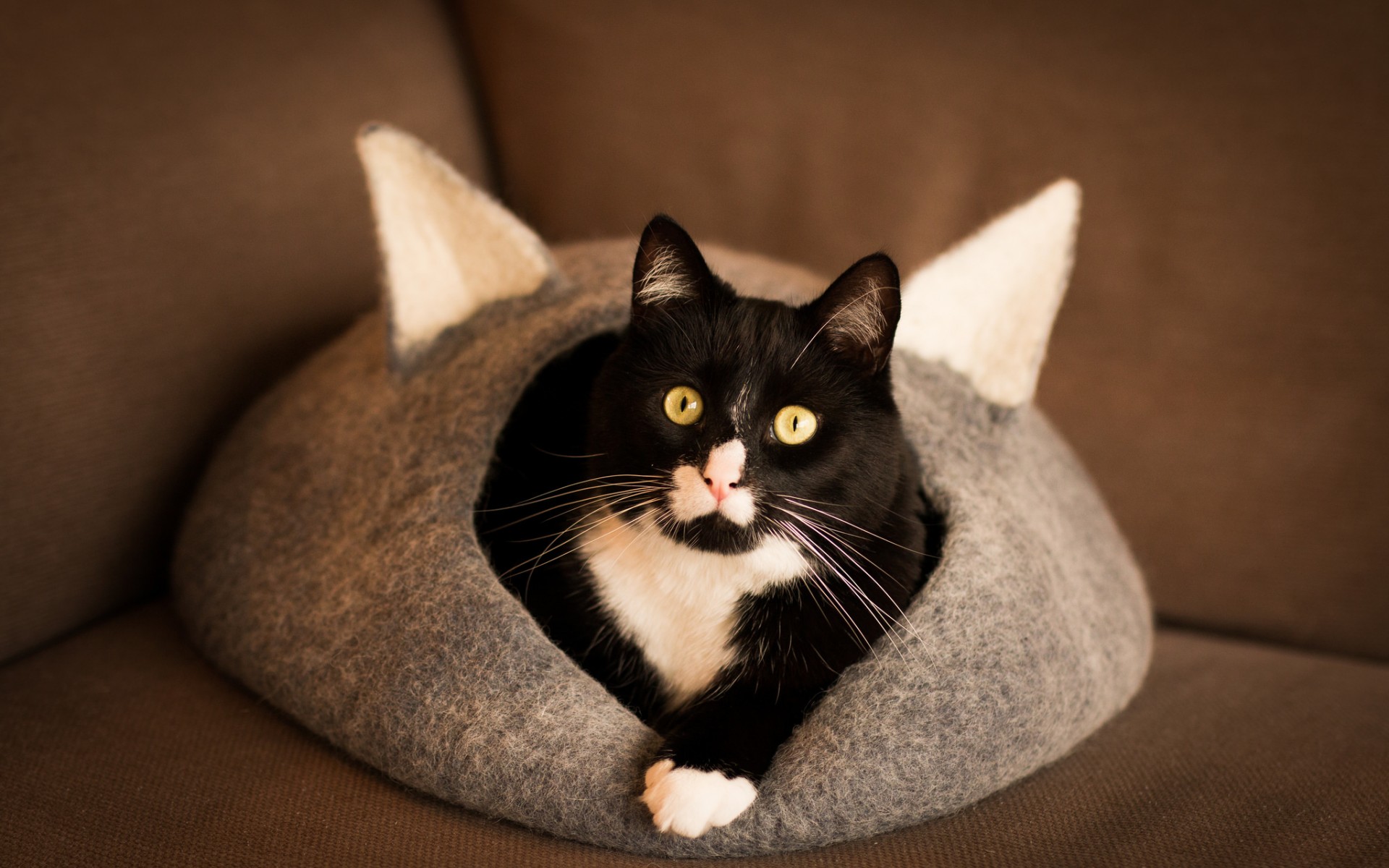 Description: A black and white cat sitting on a couch with a pillow on it's back and eyes open.