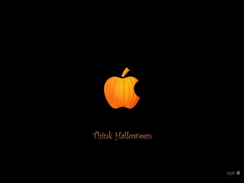 Description: A black background with an apple logo on it and a gold apple on the bottom of the image and the words think halloween.