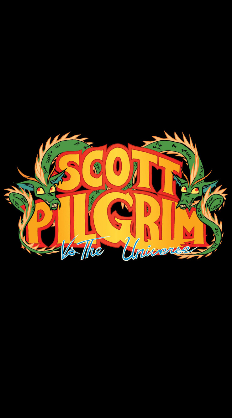Description: A black background with a yellow and red logo on it that says scott pilgrim live the game on it.