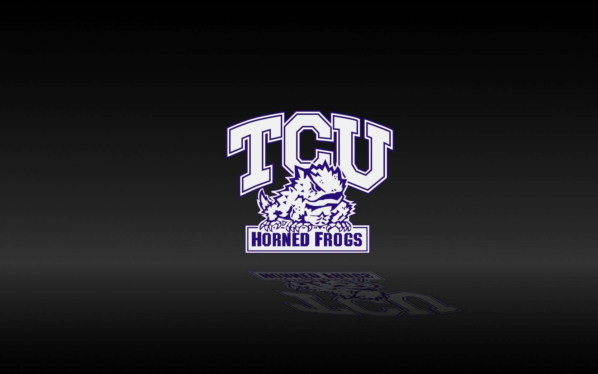 Description: A black background with a tcu logo on it and a reflection of a horse on the ground in the middle.