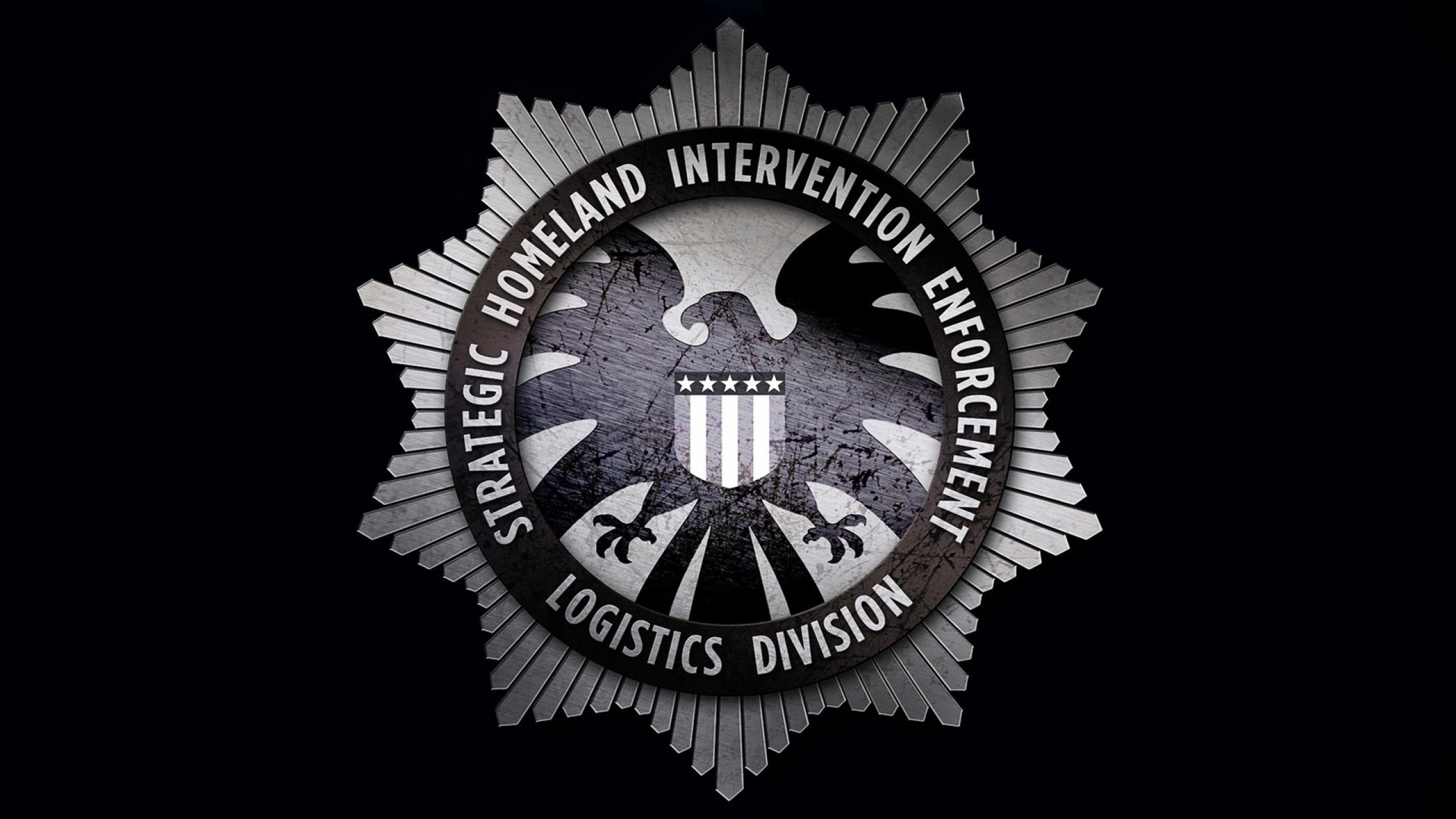 Description: A badge with a black background and a white eagle on it's side and a black background with a white eagle on it's side.