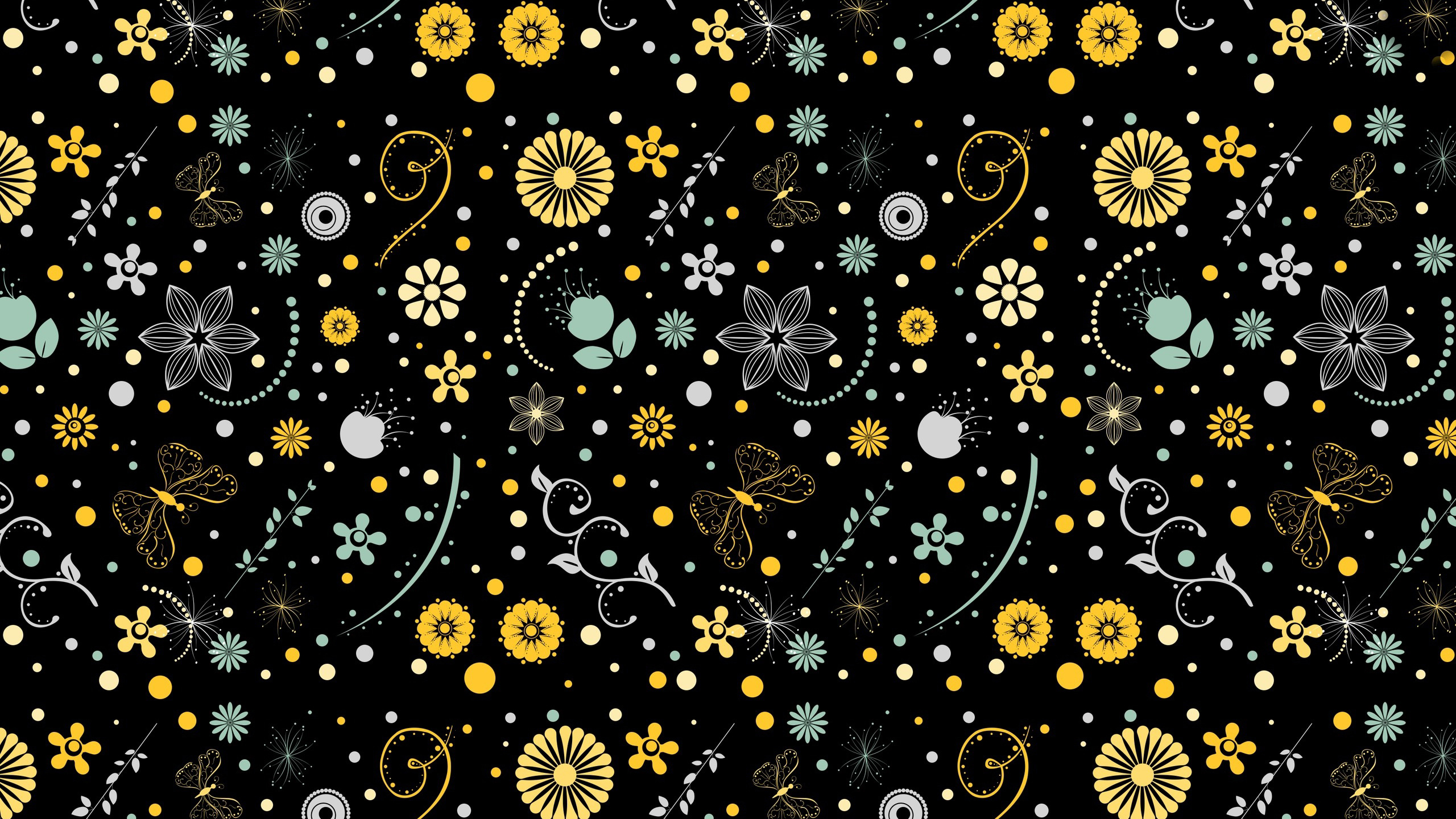 Description: A black background with yellow and blue flowers and circles of dots and circles of dots and circles of dots.