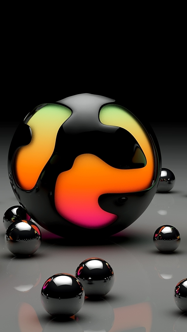 Description: A black ball with a colorful design on it surrounded by silver balls and a black background with a few smaller ones.