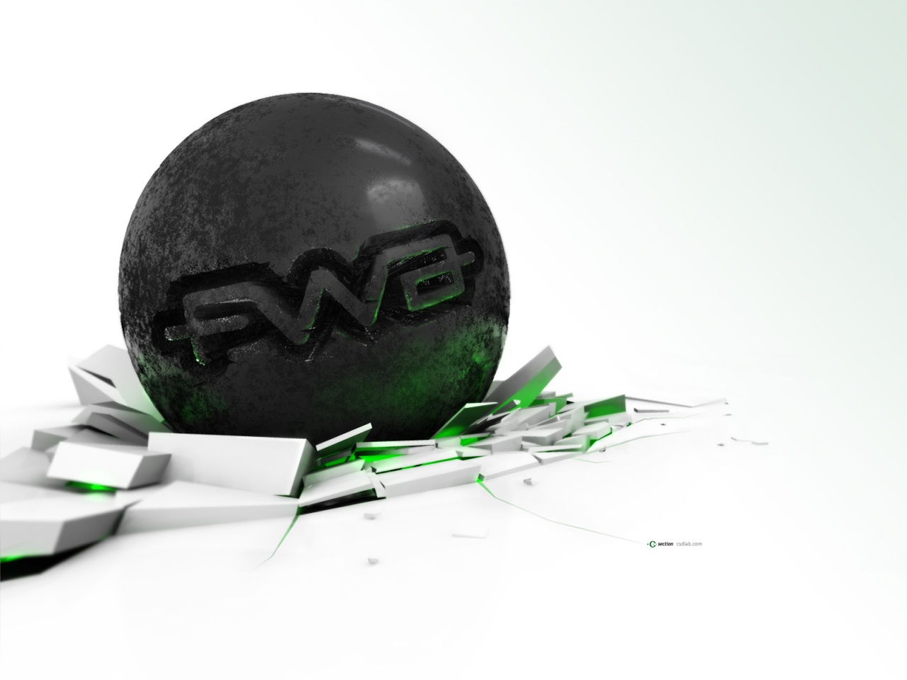 Description: A black ball with the word gwp on it is breaking through a white background with a green and black design.