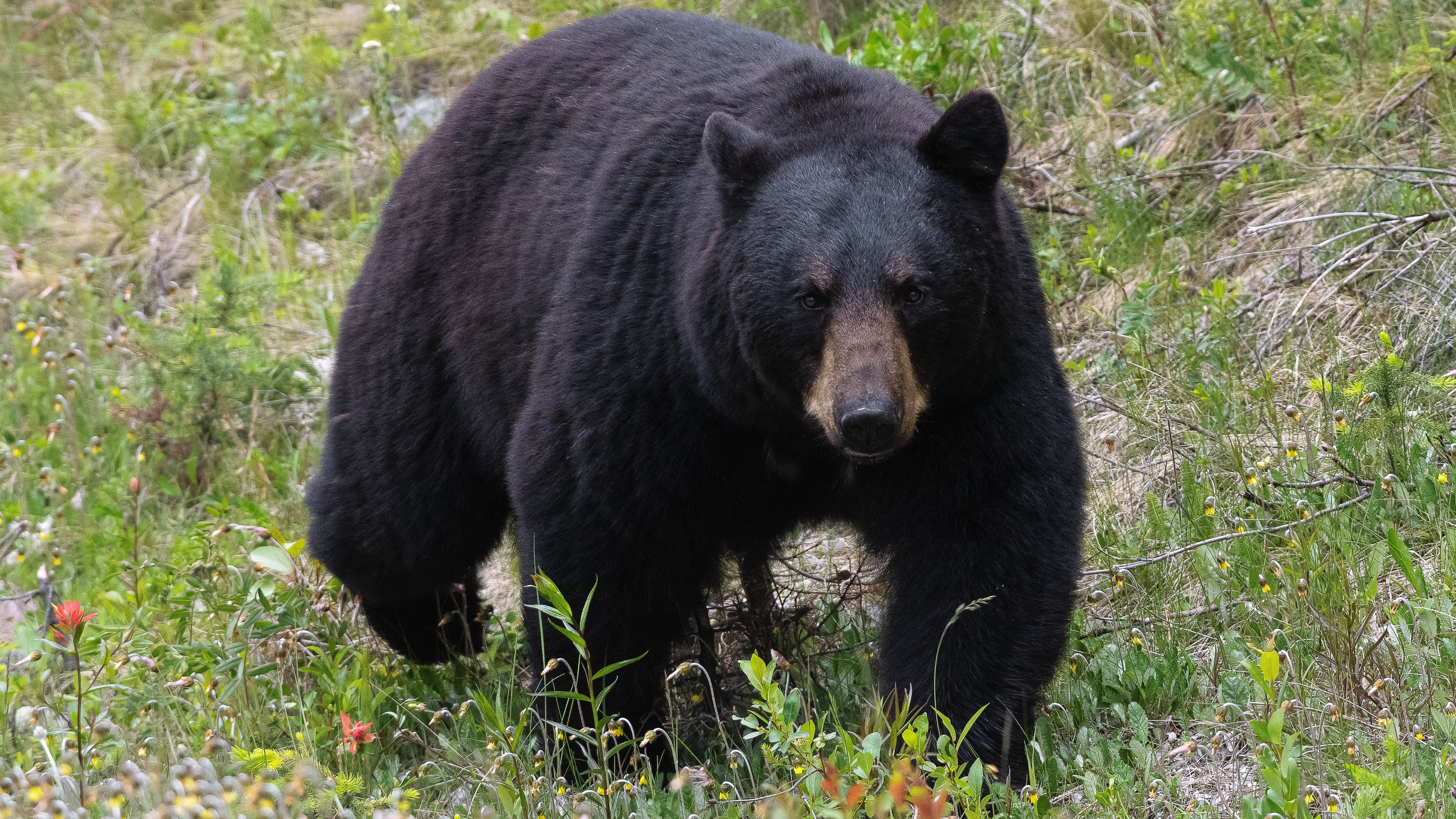 Description: A large black bear walking through a lush green field of grass and flowers on a hillside side with wildflowers.