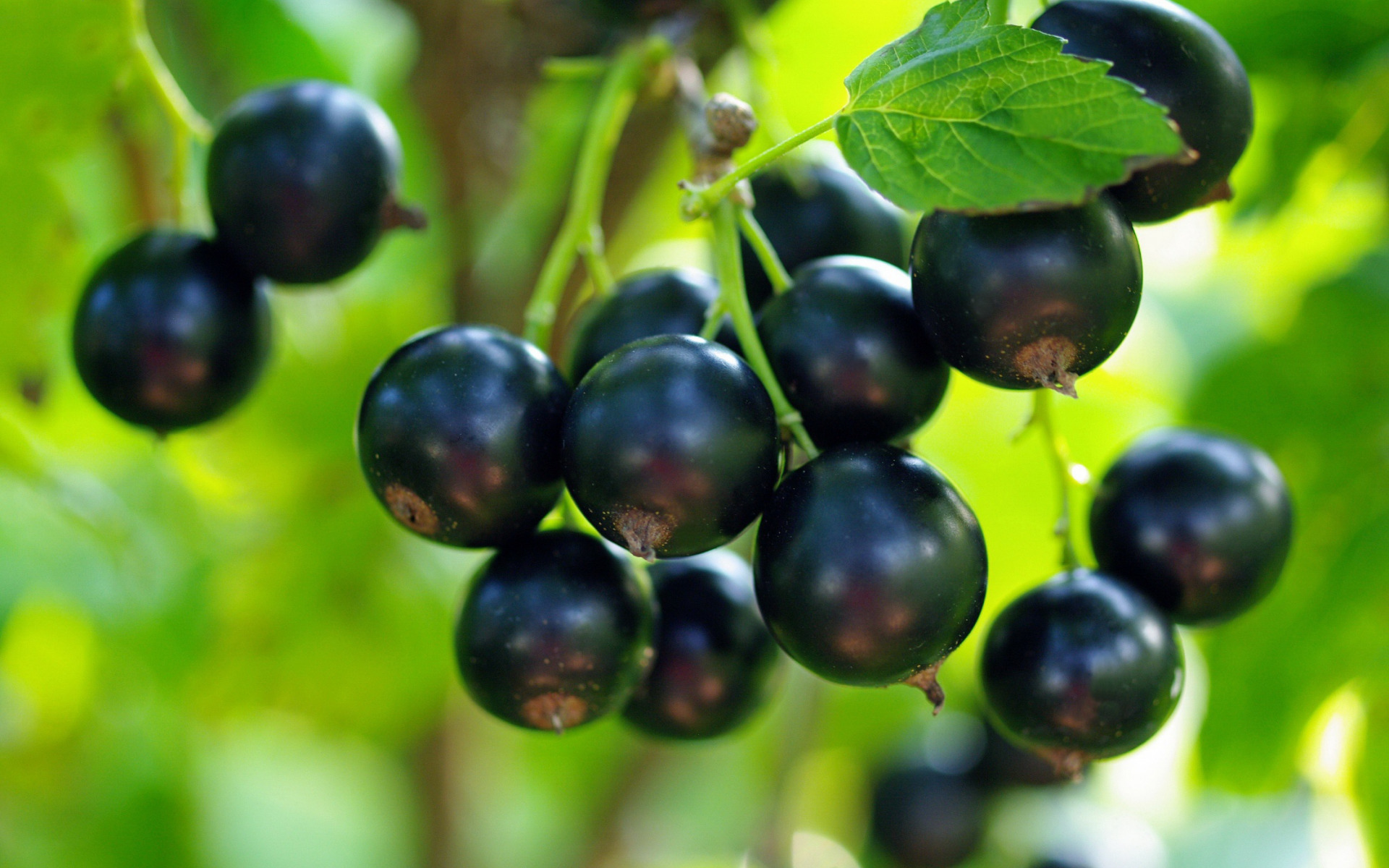 Description: A bunch of black berries hanging from a tree branch with green leaves on it's branches.