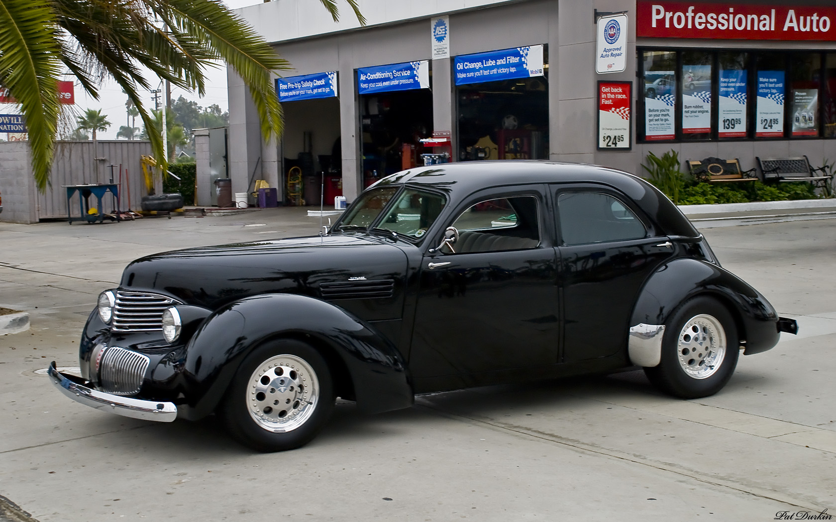 Description: A black car parked in front of a professional auto shop in a parking lot with palm trees in the background.