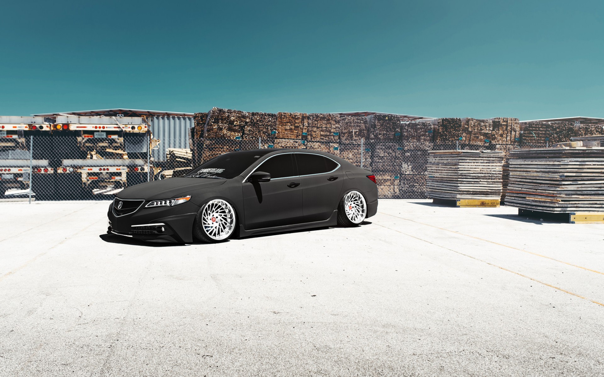 Description: A black car parked in front of a large building with a lot of wood pallets behind it and a sky background.