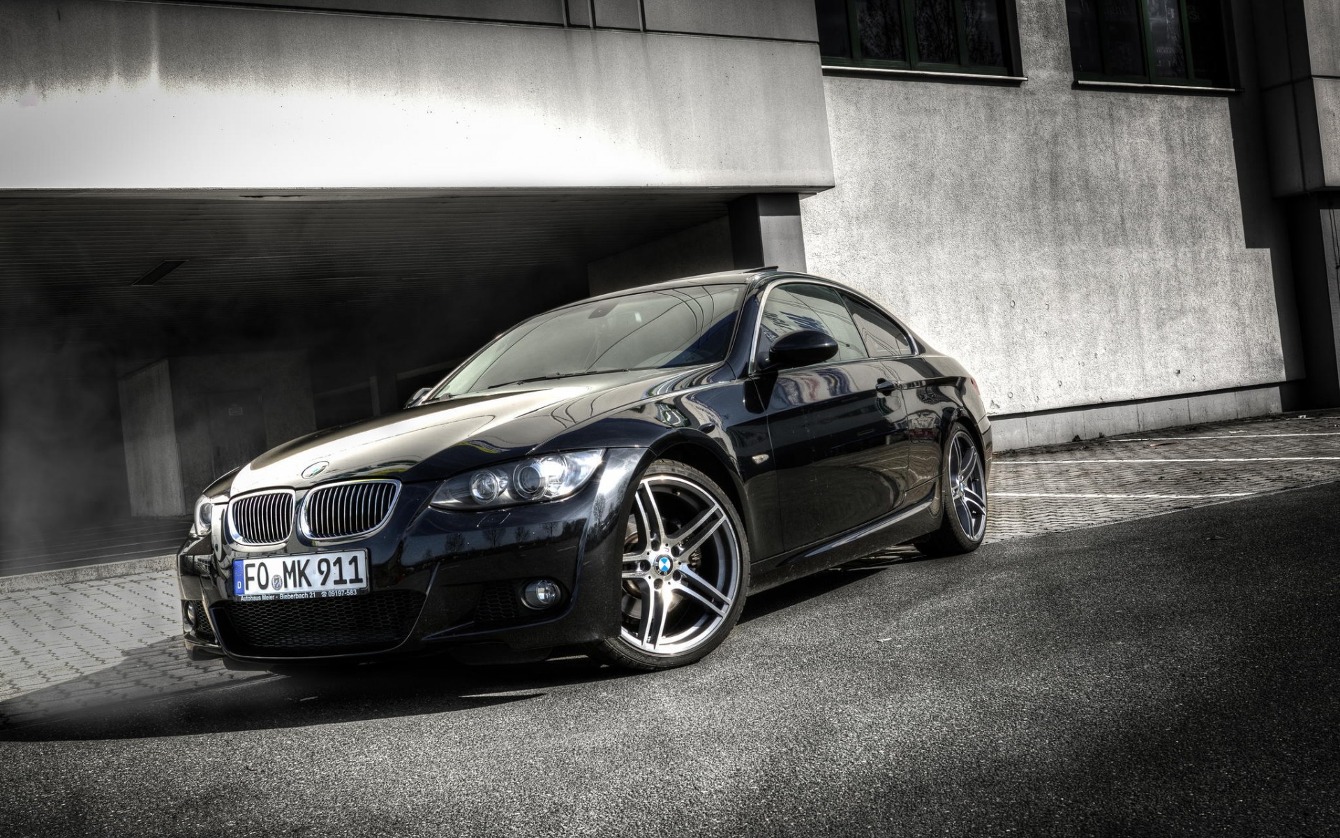 Description: A black car parked in front of a building with a parking meter on the side of it's side.